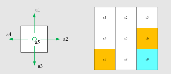 从状态 转移到状态 的概率为 1;智能体通过动作 从状态状态 转移到状态 的概率为 0,即向右走不到非 的状态 Remark:此案例是确定性(deterministic)案例,真实的案例一般是随机的(stochastic)